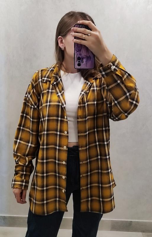 Яркая рубашка в клетку из плотной вискозы свободного кроя. Очень приятная струящаяся ткань. Актуальный желтый цвет. Сзади чуточку удлинена. Стан - идеальный Размер вказано 18(XXL),но можно и на меньшие размеры в виде оверсайза полуобхват груди -60 рукав от горла-73 длина-72/78 Одет на параметры 93/72/98, рост 160.
