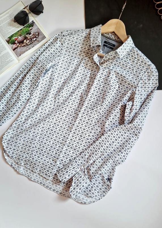 Классная хлопковая рубашка со стрейчем в составе. отличное состояние приятно садится по фигуре в жизни красивее, эа фото сложно отразить рисунок дов - 62/64 пог. - 48 тянется пот. - 43 рукав - 62