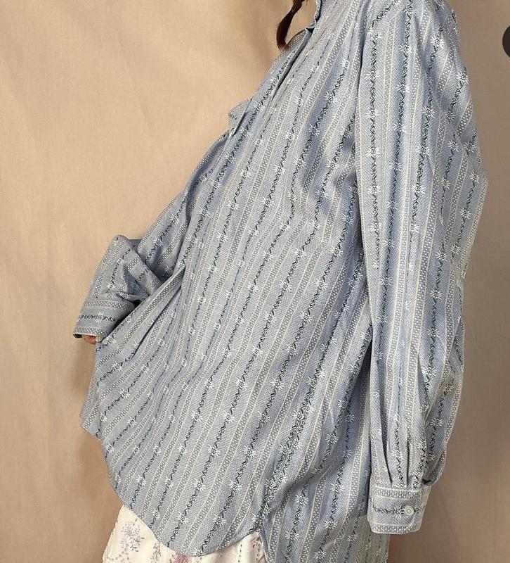 Сорочка в розмірі XL. Тканина щільна, тримає форму, не тягнеться. Колір вживу яскравіший, дефектів немає.