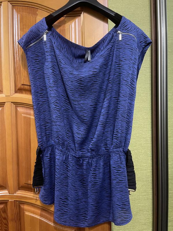 Блуза 100 % вискоза , новая, в поясе на резинке и с декоративным поясом ,в плечах дополнена змейками, красивая синяя ткань с черными элементами. Размер L на 46-48 размер. Длина блузы 73 см, ширина в талии 40 см, с помощью пояса регулируется размер. В груди блуза ложится свободно, ширина в груди 60 см.