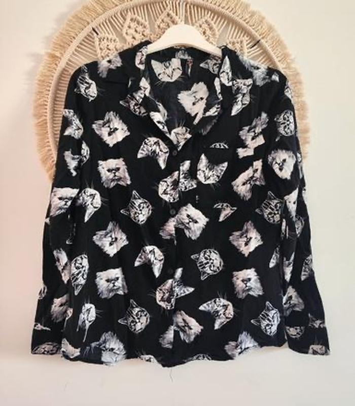 Сорочка з віскози з принтом котики від FB sisters. Розмір вказано xl, але краще на L. Довжина 69см, ширина під рукавами 55см. Повинна бути вільною.