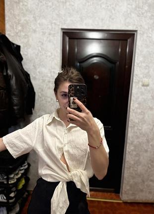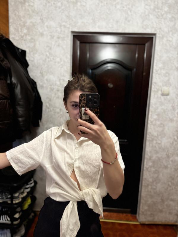 Рубашка вільного крою в білому відтінку — стильна база для щоденних образів 🤍 Модель має класичний комір і короткий рукав, застібається на ґудзики по всій довжині. Легка, приємна на дотик тканина з натуральною текстурою виглядає повітряно та трохи жатою, що додає невимушеності. Подовжений силует дозволяє носити її як самостійний верх або як накидку поверх топа.