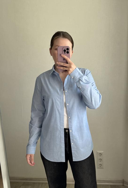 Сорочка блакитного кольору від H&M Розмір М Бірка зі складом відсутня, на дотик-катон з домішками Довжина 75 см, довжина рукава 64 см, напівобхват грудей 51 см Стан ідеальний Вдягнуто на розмір Л, зріст 167