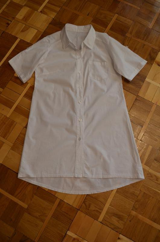 Подовжена біла сорочка. Рукава підвертаються з допомогою гудзики. Одягалася один раз. Заміри відправлю за запитом.