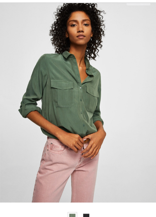 Сорочка Mango Розмір М Колір хакі, точно як на оригінальному фото Дуже приємна, легка тканина Сорочка на гудзиках, рукав підвертається на петельку Реальні заміри: Довжина спереду - 65см, ззаду - 75см Плечі - 40см Рукав від плеча - 59см ПО грудях від шва до шва - 52см Ширина внизу від шва до шва - 56см