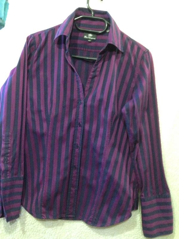 Сорочка блузка темної бузкового кольору в чорну смужку 100 %бавовна виробництво Індія, приталені силует з відкладним коміром і довгим рукавом на манжеті,довжина манжета 13 см, довжина сорочки 66 плече 11,5;рукав 61,низ 53,П. про грудей 51-100% бавовна,виробництво Індія
