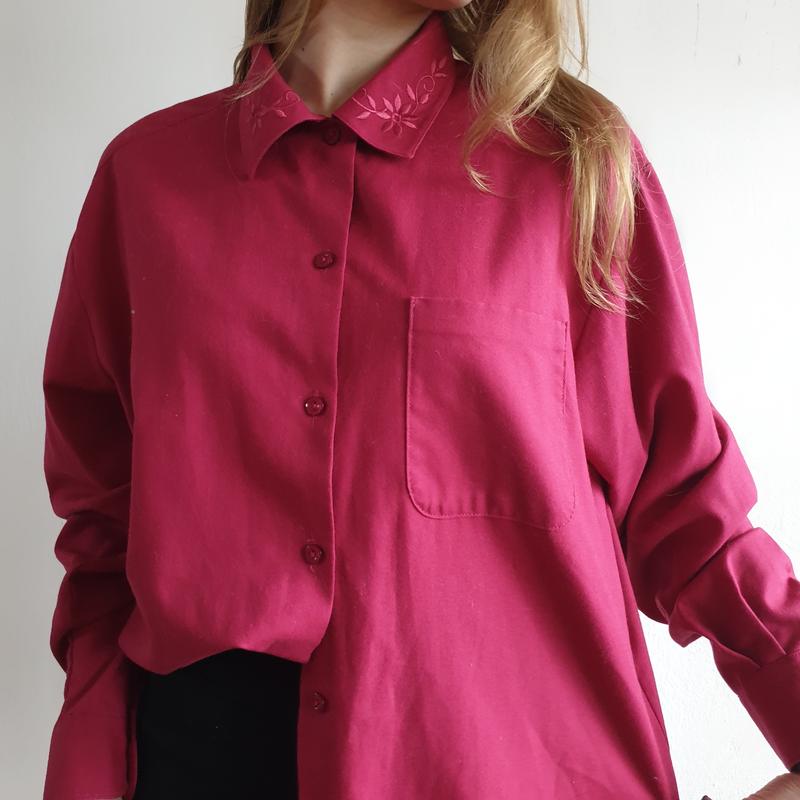 Дуже класна сорочка з глибоким відтінком пурпурного кольору! З ніжною вишивкою на комірі, що робить цю сорочку не зовсім простий,любителям мінімалізму має дуже сподобається! Є один кишенька з лівого боку на грудях) Одягнена на розмір XS/S, так як подобається оверсайз, взагалі розмір M/L.