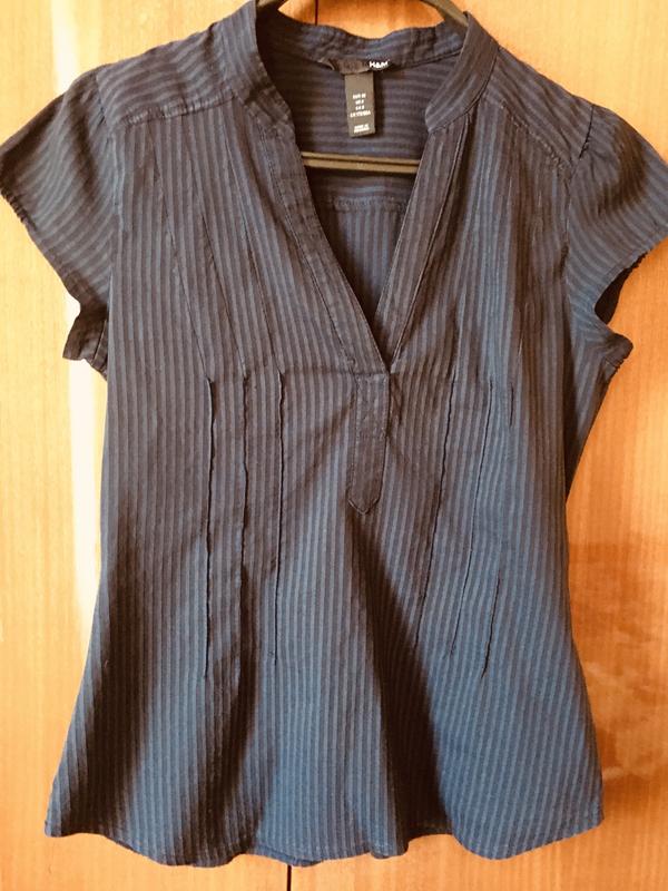 Сорочка відомого бренду , рукав короткий , по краю верху гумка, комір - стійка переходить у - подібний виріз , оброблений планкою, спереду посадочні прямі три виточки, ззаду за одна, цікава від планки складка не відкривається, низ закруглений, нюанс - фото 5, всередині трохи катишки, не впливає на зовнішній вигляд, враховано в ціні, фасон і стан максимально показано на фото. Тканина темно синя , ближче до чорного, в смужку світліше, тягнеться, добре сідає по фігурі, розмір вказаний 38, орієнтуйтеся по замірах. Заміри: дл від плеча до низу-60, довжина плеча-10, дл плечей-33, за пройми рукава - 19,5, довж рукава від плеча до низу-11, з рукава внизу -17, пог-42, пот-38, побіди -41, по низу -47, заміри зроблені в спокійному стані, відповім на всі питання