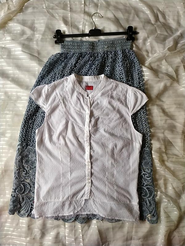 Стан дуже хороший . Бирка складу тканини та розміру відсутня . Тканина натуральна , бавовна тоненький , білосніжна , деякі фото вийшли темнуваті . Трохи приталені .Розмір на наш 46 - L , дивіться будь ласка заміри . Від пахви до пахви 50 див. Талія 45 см . Довжина 62 см .