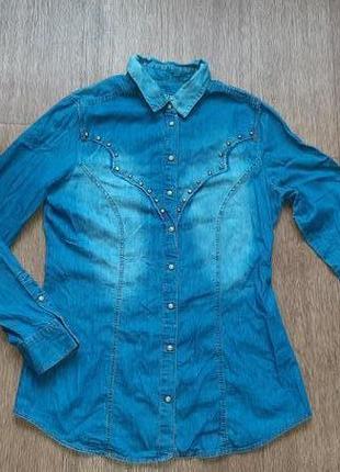 Стильна джинсова сорочка.Цікава модель,декорована заклепками зі стразами.Застібається нс кнопках.Відмінна довжина.На розмір 38.