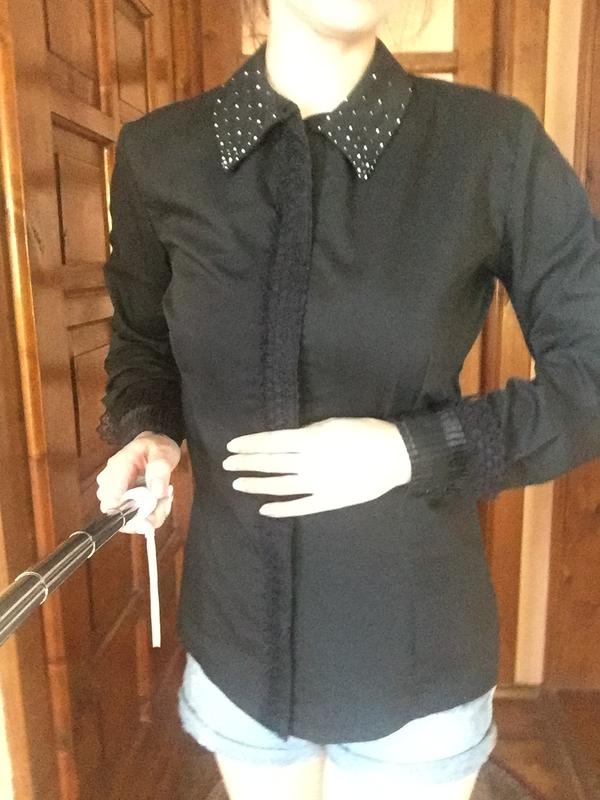 Рубашка украшена кружевом на манжетак и от воротника в низ, скрывая пуговицы. Воротник расшит бисером