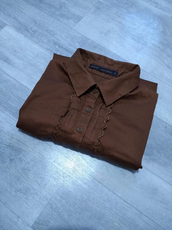 Сорочка жіноча коричнева. Заміри: плечі 37,5 см, пог 48 см, побіди 51 см, рукав 63 см, довжина по спині 63 см, пот 43,5 см