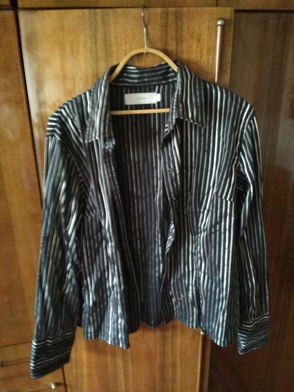 Красива жіноча сорочка чорна в білу смужку,є нюанси: плями (незнаю що виводяться або ні) внизу якщо заправити то невидно,зашито акуратно вище грудей спереду,ПОГ-57см,рукав-65см,довжина-60см