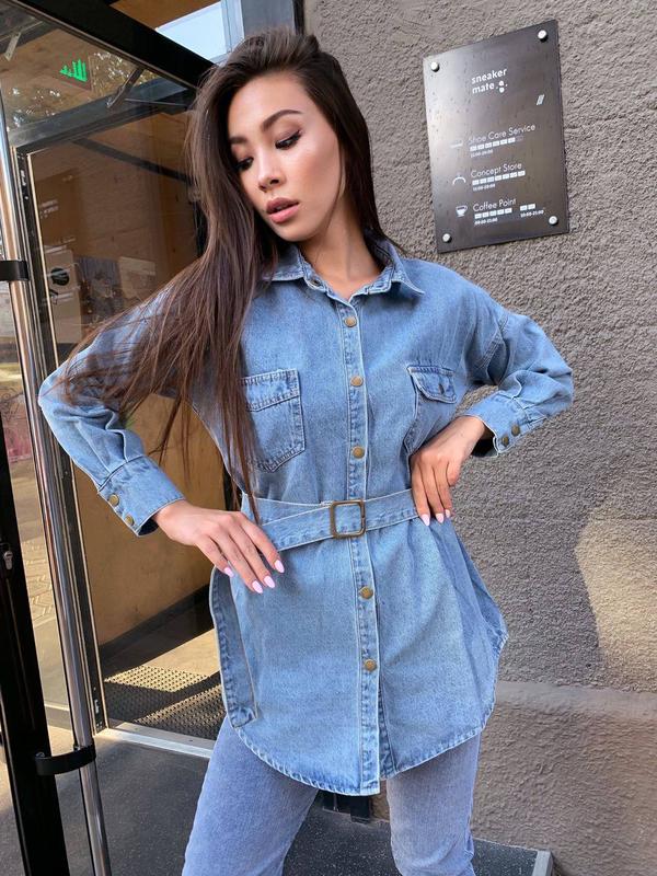 Джинсовое платье-туника с поясом😍 Мод: 231 Размер: универсал 42-46 Цвет: голубой Ткань: джинс коттон Длина 78см
