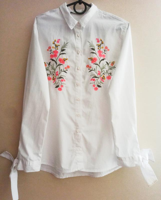 Очень красивая рубашка белого цвета с вышивкой, внизу на рукавах завязки. Отстираю НП после полной оплаты.