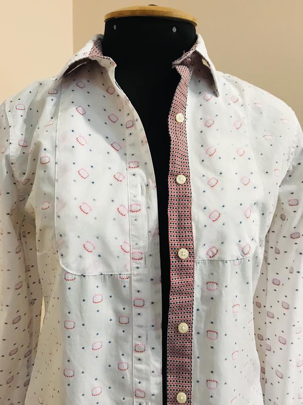 Біла в рожевий малюнок бавовняна сорочка. Розмір вказаний М ідеальний Стан, дефектів немає Довжина по спинці 64 см, рукав від плеча 62 см, плечі 39 см, ПОГ 48 см, ПОТ 42 см, ПОБІДИ 49 див.