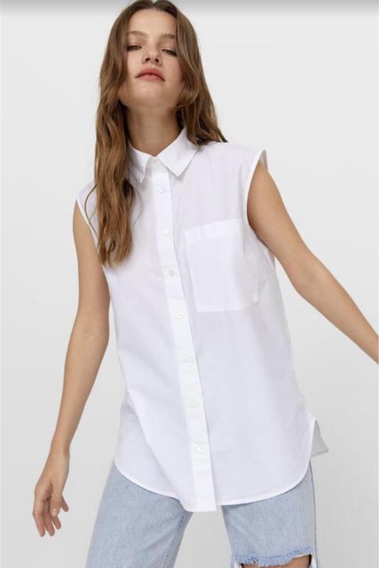 Качественная рубашка без рукав, пуговицы скрыты Состав: 100% cotton Замеры: плечи открытые 33 см, ширина в груди 47 см, ширина внизу 50 см, длина 65 см Размер указан 34