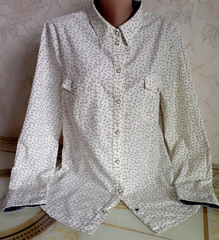 Котонова , фірмова сорочка на кнопках у принт "ножиці" , плечі 40 , ПІГ 50 , ПІТ 46 , рукав 60 , довжина 67 . Колір молочний .