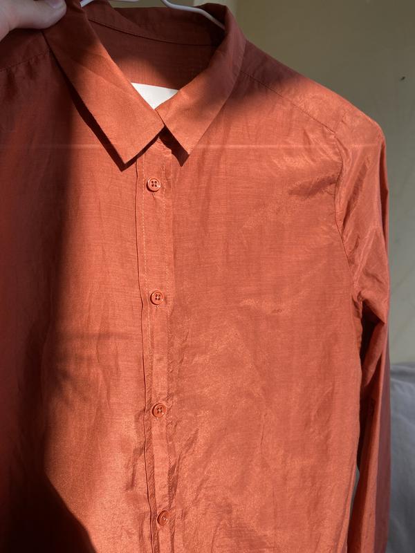 Аж блищить на сонці, дуже легка шовкова сорочка Завдяки гудзику можна збирати рукава три чверті Розмір 36, С Ззаду подовжена Склад: 70% бавовна, 30% шовк Довжина рукава від плеча 61 Плечі 38 Довжина ззаду від воріт 78 Спереду довжина від верхнього ґудзика 70 ПОГ 47