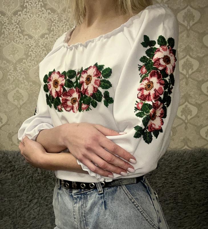 Сорочка вишита чеським бісером. Ручна робота. В ідеальному стані. Розмір XS-42. Заміри: Длінна рукава в чотири четверті 44 см Длінна сорочки 57 см Напівобєм грудей 47 см Пересилаю