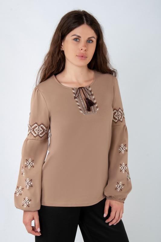 Жіноча вишиванка з пишними рукавами з вишивкою, вишита бежева трикотажна сорочка жіноча