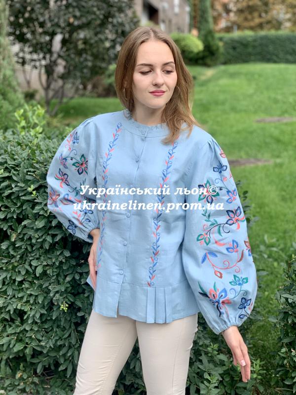 Блуза лугань блакитна льняна, вишиванка, галерея льону, з вишивкою 40-52рр.