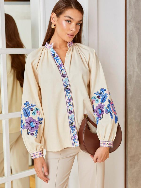Вишиванка стильна сорочка молочна з блакитною вишивкою квіти