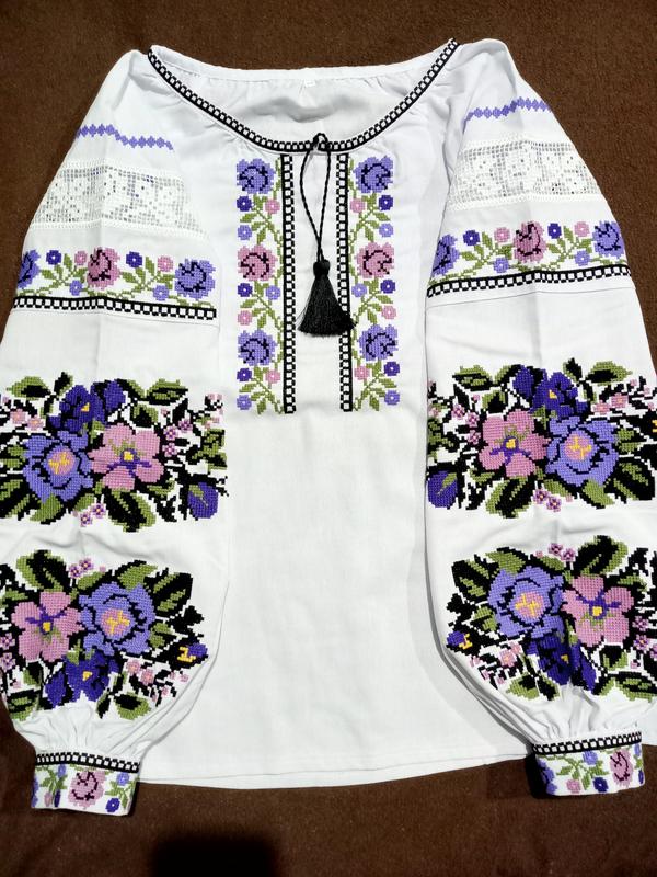 Яскрава вишивка. Тканина льон з візкозою, колір білий. Вишивка машинна хрестиком. Поєднання з філейним мереживом . Догляд- ручне прання в прохолодній воді , або хімчистка.