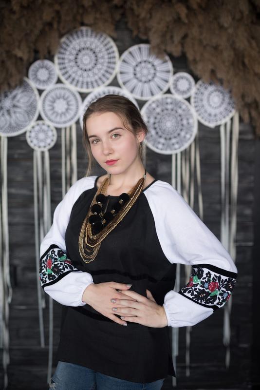 Тканина - льон чорний, біла домоткана Техніка виконання - хрестик (ручна вишивка), оздоблена оксамитовою стрічкою Нитки - ДМЦ