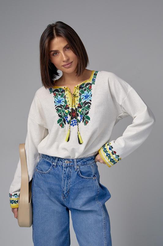 Ця сучасна жіноча вишиванка легко впишеться у ваш гардероб, роблячи кожен look особливим. Все завдяки квітковій вишивці та мереживу, якими прикрашена блузка. Країна виробник: Туреччина Матеріал: Льон Склад тканини 95% бавовна, 5% еластан ЗАМІРИ ВИРОБУ Довжина переду виробу S - 60см; M - 61см; L - 62см Ширина під проймами рукавів (над грудьми), S - 52см; M - 54см; L - 56см Довжина рукава від горловини S - 72см; M - 73см; L - 74см Довжина рукава по внутрішньому шву S - 46см; M - 47см; L - 48см