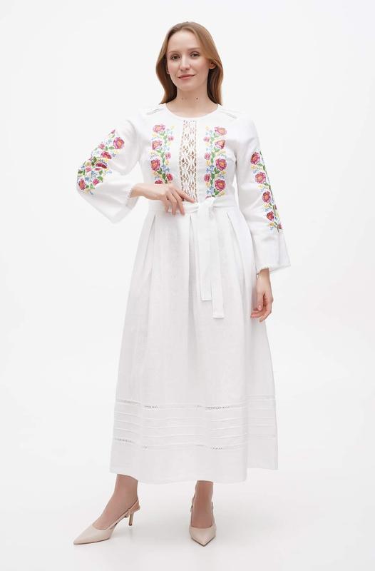 Сукня з білого льону з поясом. Вишивка гладдю+ мереживо. Застібка-блискавка по спинці. У бічних швах розташовані кишені. Розмір 42-54. Ціна 4950 грн