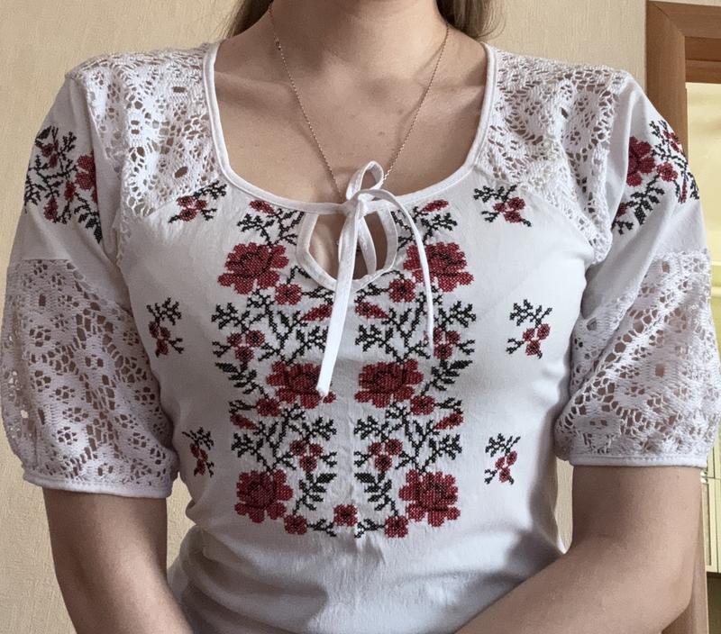🌺 Оригінальна та стильна жіноча українська вишиванка з червоно-чорною вишивкою хрестиком і вставками мережива. 📌 Розмір – 44. 📌 Заміри по виробу: — напівобхват грудей: 40 см (але тканина еластична, то ще потягнеться на 4 см точно). 📌 Склад: бавовна - 73%, поліестер - 22%, лайкра - 5%. Вишиванка підійде на розміри XS-S, можливо, і на маленьку М. Якщо необхідні ще якісь заміри чи інші уточнення, пишіть в особисті😌