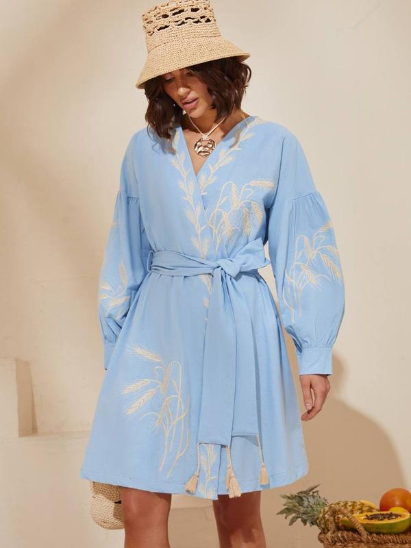 Стильное платье вышиванка, голубое платье на запах с вышивкой, вышитое платье