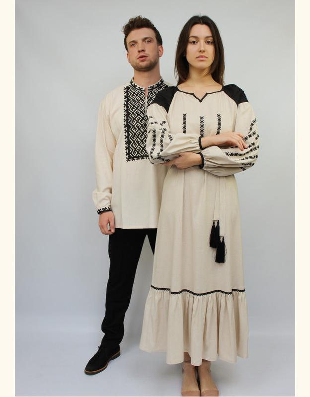 Парні вишиванки бежеві лляні "podillia" з чорною вишивкою сукня + сорочка