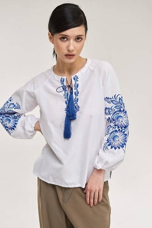 вишиванка підліток/дорослі вишиванка виконана в молодіжному стилі рослинний орнамент💮🌺🌸 машинна вишивка у синьому відтінку горловинка завязується синіми китичками тканина -домоткане полотно склад 52% бавовна , 48% поліестер заміри по виробу ВИШИВАНКА МАЄ БУТИ ВІЛЬНОЮ! розмір: довжина виробу/довжина рукава від горловини/ обєм грудей, см S: 64см/60см/104см На фото модель у розмірі S Параметри моделі: Ог 88 см, От 62 см, Об 88 см Ріст моделі: 168 см