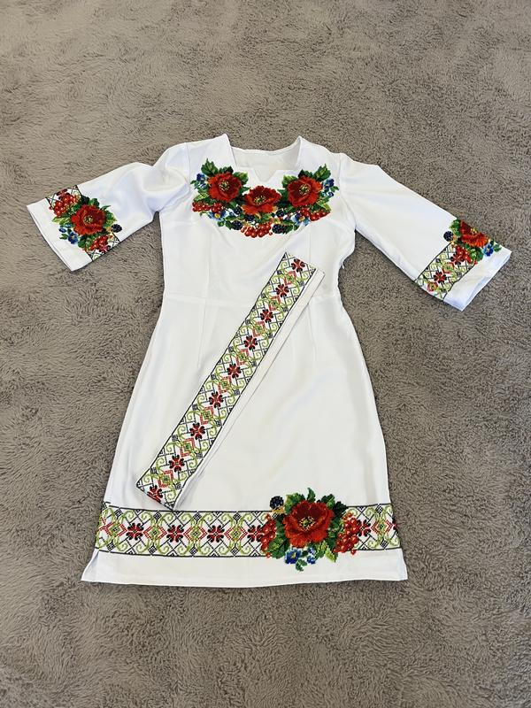 Вишите плаття бісером, ручна робота, збоку на талії на замочку, присутній пояс (по 55см), довжина 90,5 см, рукав 43 см, талія ПО 36 см, груди ПО 41 см. Одягнуте 2-3 рази. Буде на розмір хс-с. Присутній торг в межах розумного. Заглядайте на мою сторінку, багато одягу)
