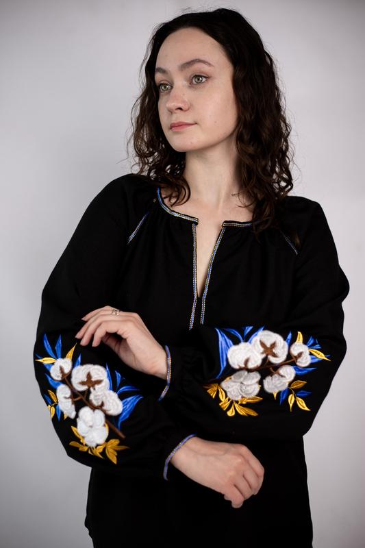 Відчуйте себе справжньою патріоткою в жіночій вишиванці на чорній тканині з вишивкою в національних кольорах - синьому та жовтому. Ця вишиванка не лише підкреслить ваш стиль та елегантність, але й віддзеркалить вашу гордість за українську спадщину.