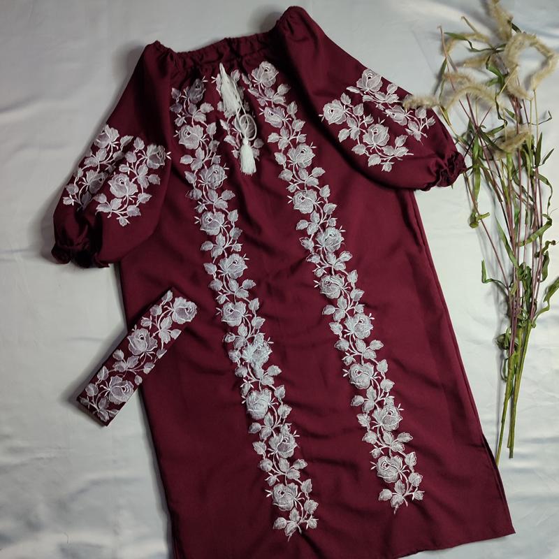Вишита сукня жіноча ◽ Тканина: габардин ◽Колір: бордовий ◽Розмір: ХL-2XL (50-52) ◽Заміри: ПОГ 57,5 Довжина 101 Довжина рукава 44,5