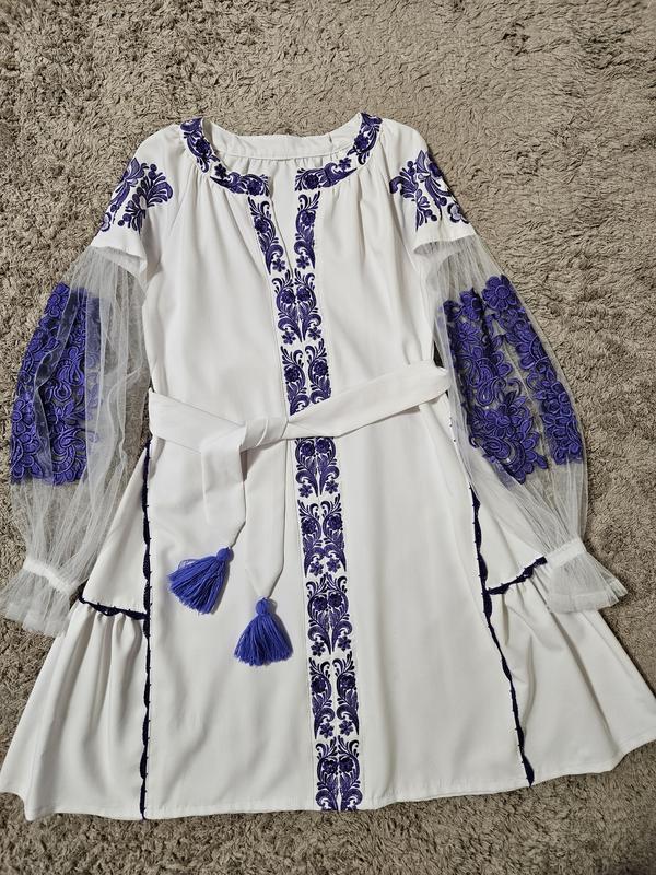 Дуже гарний стан підійде на розмір S/M/L тканина білосніжна, візерунок насичено фіолетовий фасон трапеція, можна з поясом або без довжина 90 см півобхват талії 45 см півобхват бедер 60 см довжина рукава від шиї 69 см Рукав сіточка, внизу резинка з рюшею