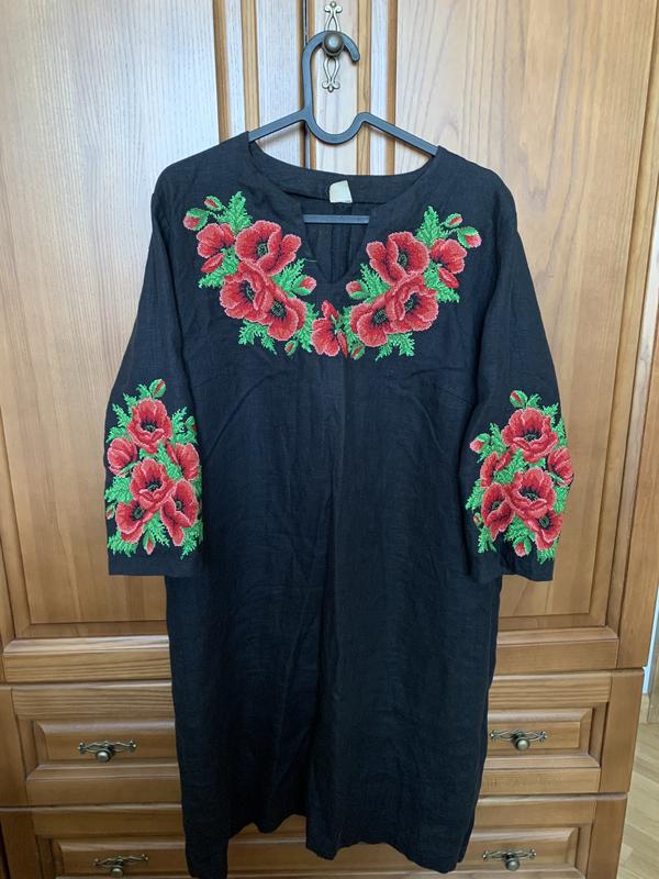 Сукня вишита ручна робота 50 52 розмір маки льон чорна плаття вишиванка хрестиком