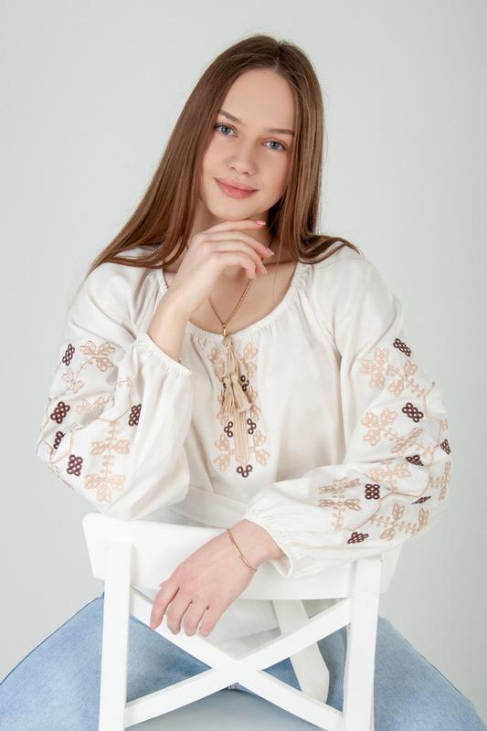 Через Шафу отправок нет❗ Женская вышитая рубашка с длинным рукавом выполнена из льняного полотна. Льняная ткань отличается высокой прочностью, отлично впитывает влагу, обладает хорошими свойствами воздухо- и теплопроницаемости, проста в уходе и долговечна в использовании. Изюминкой данной модели является интересный вышитый узор и объемные рукава. Полотно: лляна тканина Состав: 55% лен, 45% вискоза. Вышитый орнамент: машинная вышивка. Советы по уходу: стирать при температуре не более 30°C. Разрешается стирка в режиме "ручная" или "деликатная", вышивку гладить только с изнанки. Изделие может давать незначительную усадку. Параметры модели: обхват груди 80, талия 62, бедра 94, рост 166 см. Размер одежды 42.