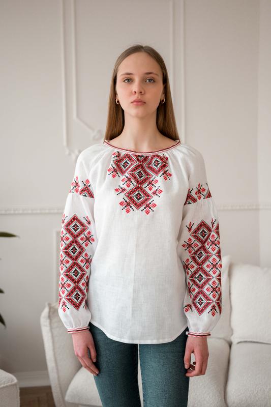 Стильна жіноча вишиванка біла сорочка з червоною вишивкою 4652