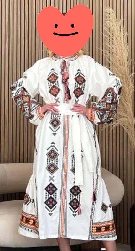 Сукня-вишиванка прикрашена вишитим геометричним орнаментом з машинної вишивки гладдю. Кругла горловина спереду доповнена шовковими зав'язками. Довгі рукави-реглани внизу обшиті широкими манжетами із застібкою на ґудзик. Передня частина виробу, окантування горловини, планка, а також рукави прикрашені геометричною вишивкою в техніці гладь. Застібка на ґудзики. Низ сукні плавно розкльошений за рахунок вставок із оборками з боків, які оздоблені оригінальною вишивкою. Пояс входить до комплекту. Пог-58 Поб-60
