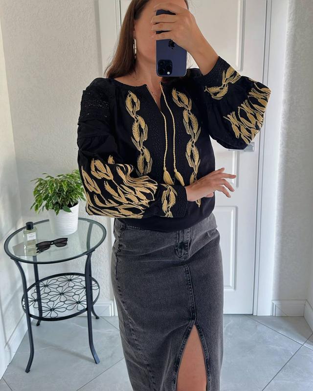 Вишиванка Є парна чоловіча💙 Модель 6001 Виробник Туреччина 🇹🇷 Розміри s m l Вишивка машинна гладь золотою ниткою Кольори: чорна та біла Країна виробник: Туреччина 🇹🇷 Стильна вишиванка з золотою вишивкою в сучасному виконанні. Об’ємні рукави з декоративними мереживними вставками. Універсальний фасон, що пасує до спідниці, штанів або джинсів. Склад тканини: 80% бавовна, 20% поліестер. Заміри: S НОГ- 51 см Довжина- 59 см Довжина рукава від горловини-68 см М НОГ- 53 см Довжина -59 см Довжина рукава від горловини- 68 см L НОГ- 55 см Довжина- 59 см Довжина рукава від горловини- 68 см Похибка вимірювання +~1см