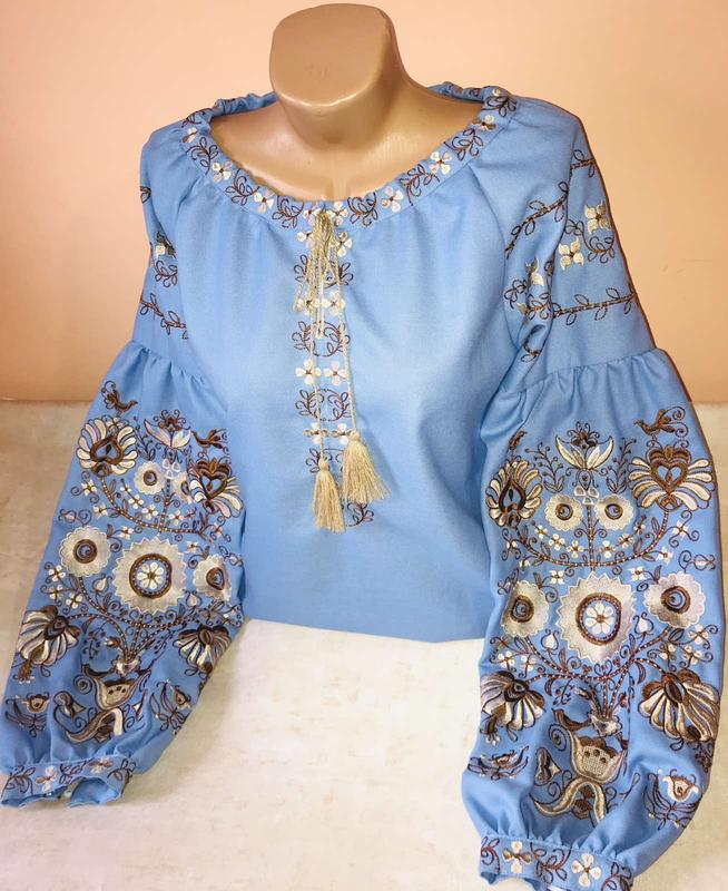 Вишиванка жіноча на блакитному тлі з багатою вишивкою