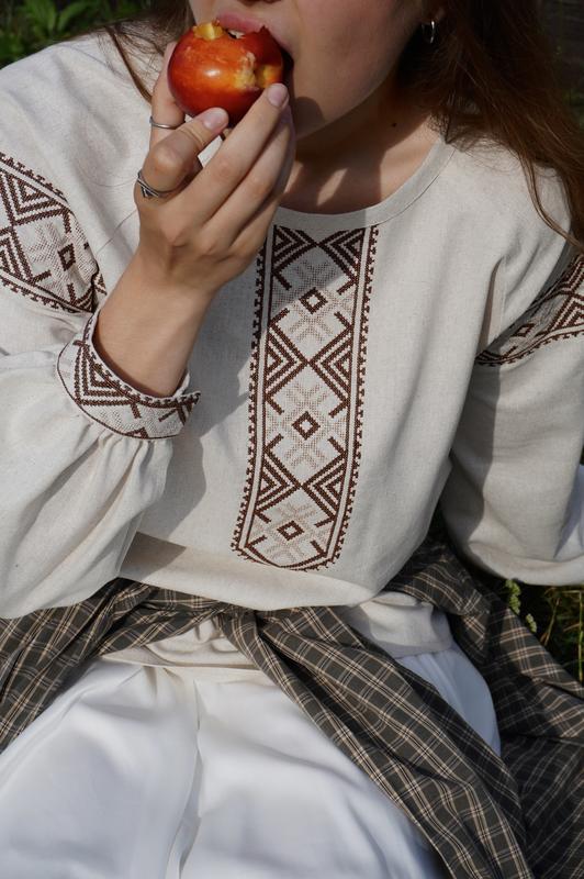 Вишиванка жіноча з кориченвим орнаментом полуничник льон