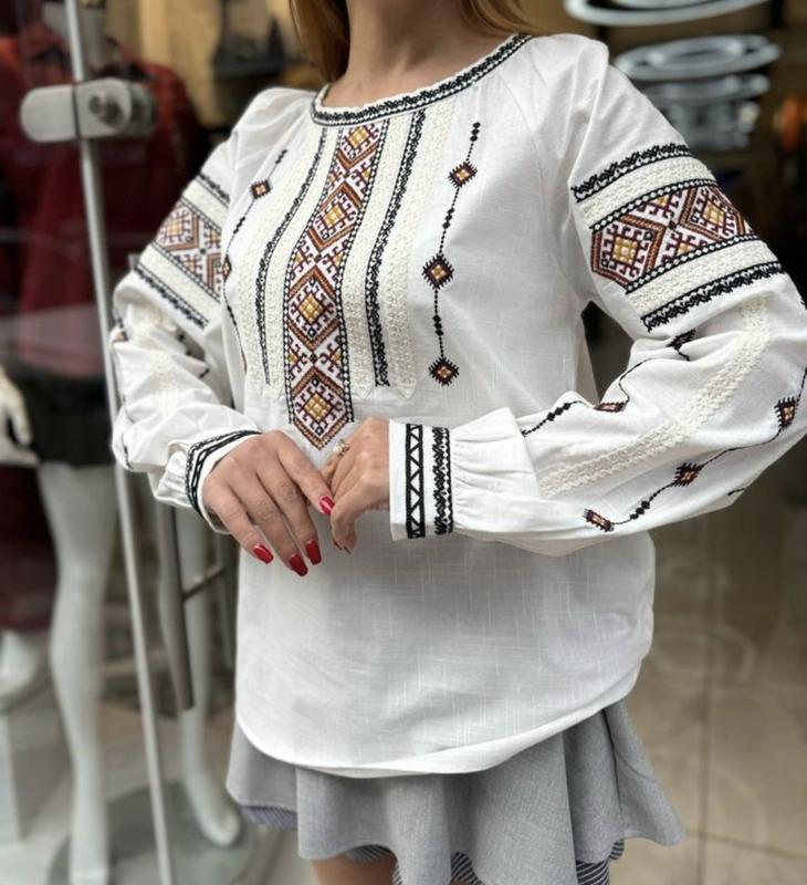 Вышиванка женская белая с геометрическим орнаментом Цвет ткани - белый Материал: 100% хлопок Ткань легкая и натуральная, можно носить и летом и в демисезон. Вышивка машинная. Вышиванка сочетает вышивку и натуральное кружево Размеры: S Модель хорошо подойдет на более высокий рост. Для низкого роста будет длиновато, или нужно будет заправлять Замеры S размер Длина рукава от шеи - 73 см Ширина по изделию под руками - 50 см Длина вышиванки - 68 см ОГ по телу желательно не более 90 см Отправка Новой почтой, Укрпочтой, Мист, Оплата - наложенным платежом (предоплата 100 грн), на карту или можете оформить безопасную покупку через шафу