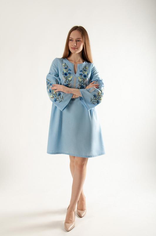 Сукня - вишиванка виготовлена з полотна "Льон", довжина "До коліна". Модель має зручний та стильний крій, рукава донизу розширені. Сукня прикрашена гарною вишивкою. Така річ чудово підійде для урочистих подій, зустрічей та прогулянок, її легко комбінувати з класичними туфлями "Човники", лоферами чи кросівками. Полотно: лляна тканина Склад: 55% льон, 45% віскоза. Вишита орнамент: машинна вишивка. Поради щодо догляду: прати при температурі не більше 30°C. Дозволяється прання в режимі "ручне" або "делікатне", вишивку гладити тільки з вивороту. Виріб може давати незначну усадку. Параметри моделі: обхват грудей 80, талія 62, стегна 94, зріст 166 см. Розмір одягу 44 Довжина виробу 92 см Ширина виробу по грудях 48 см Ширина виробу по талії 44 см Довжина рукава від плеча 54 см