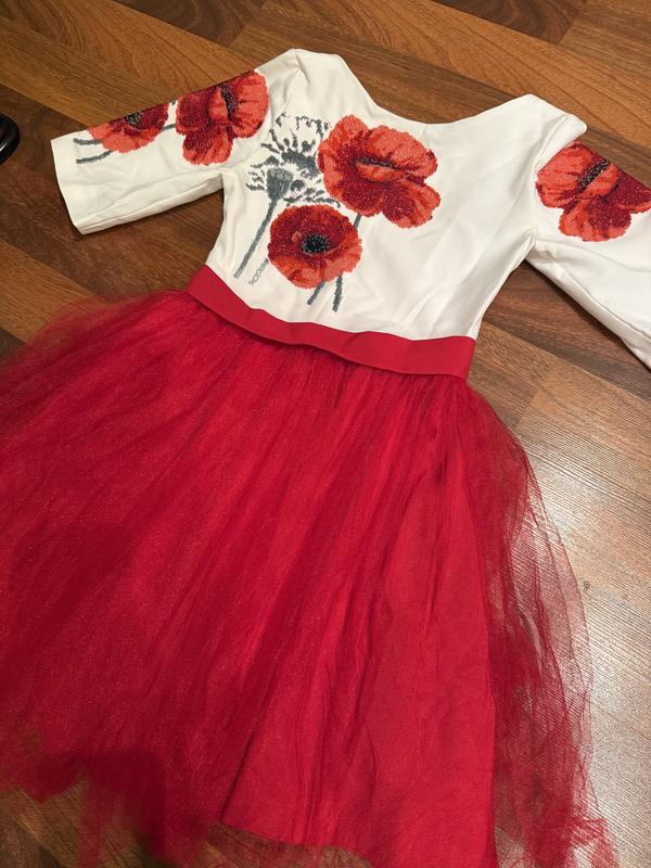 Неймовірно красива сукня у вишиванковому стилі з ручною вишивкою бісером. На грудях та рукавах - обʼємні маки, виконані вручну, що робить кожну сукню унікальною. Верх - з якісної тканини, низ - пишна фатинова спідниця насиченого червоного кольору. Ідеально підходить для свят, виступів, фотосесій чи особливих подій. • Розмір: S/M ° Стан: нова/одягалася лише раз Авторська ручна робота.