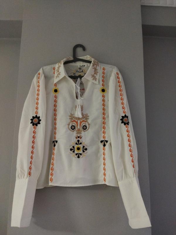 Вишиванка Сонячна L р,гладь в жовтогарячих тонах.Жовті соняхи.Оранжеві декоративні хвилі.Вишивка спереду та ззаду.Дуже гарно пошиті рукави з довгим манжетом,декоровані золотими гудзиками.Довж на 57,НОГ55.Нова з біркою,90%бавовна.